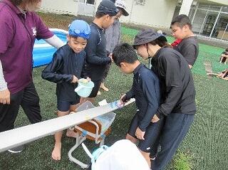 梅雨があけるのと同時にビニールプールに空気を入れて中庭で水遊びを始めました。30度を超える気温が続き児童たちも暑さに負けそうでしたが、水遊びが始まると水を得た魚のように笑顔と笑い声が中庭に響きます。水鉄砲でどこまで水が飛ぶか試したり、プールの水に物を落としてはじける水を見て楽しんだり、気持ちよさそうにプールに寝転んでみり、頭から水を浴びて大喜びしています。まだまだ暑い夏を水遊びで乗り越えていけそうです。