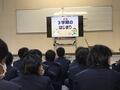 集会では、給食の歴史の移り変わりや、普段の給食がどのように作られているかを栄養教諭の先生から説明していただきました。どの生徒もスライドに釘付けになりながら、興味深く説明を聞いていました。昔の給食の写真を見た生徒からは、「鯨の竜田揚げを食べてみたい。」という声も聞かれました。