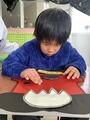 茶色の色画用紙をちぎって糊で貼り「とんかつ」を作ったり、緑色のお花紙をちぎって茶色の色画用紙に貼って「わかめの味噌汁」を作ったり、小さく切った白いモールを糊のついた画用紙にパラパラ落として貼り付け「こんもりごはん」を作って、お盆の上にみんなが好きなメニューが並びました。協力して作ったメニューに大喜びの3人でした。これからも毎日しっかり食べて、どんどん大きくなります。