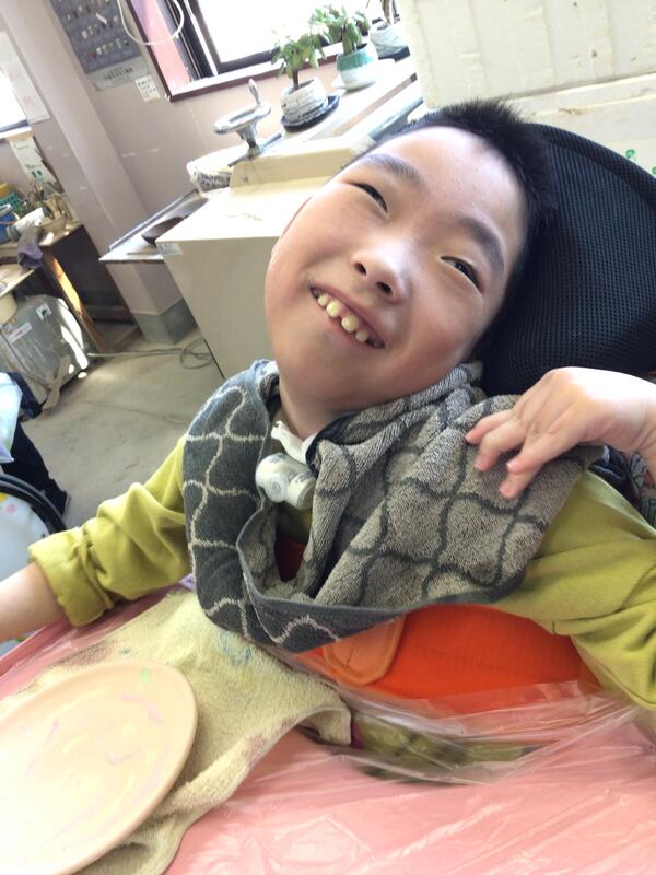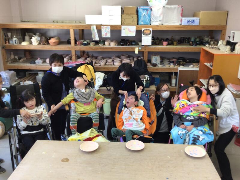 事前にデザインを考えて、手形やスタンプ・筆を使って教師と一緒にペタペタ、塗り塗り。最初はちょっと緊張している児童もいましたが、慣れてくるととっても嬉しそうで、満面の笑顔で頑張っていました。粘土の感触体験は、喜んで触っている児童もいれば、感触が苦手な児童もいましたが後半はちょっと慣れてきた様な姿もあって、とても素敵な体験ができました。