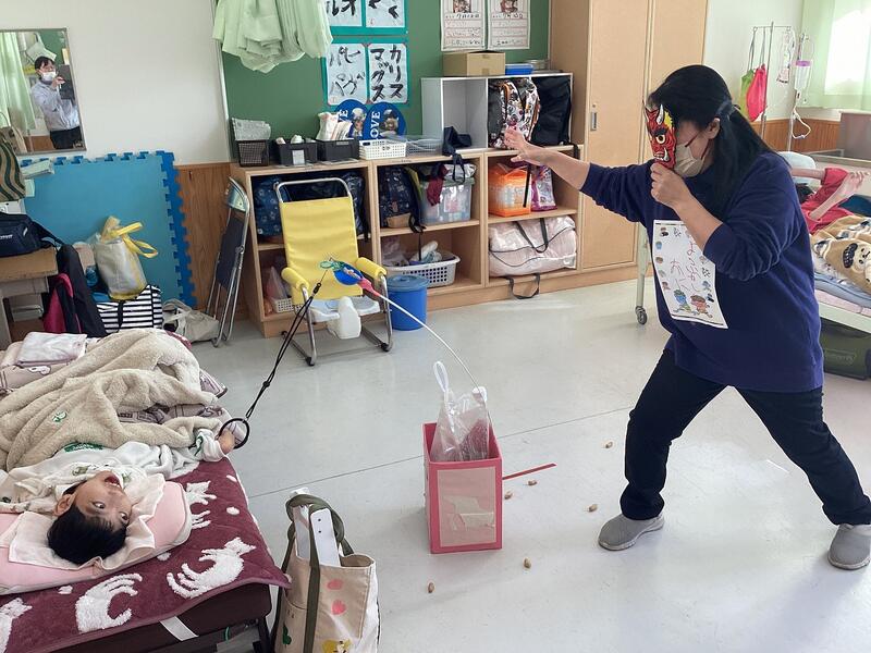2月3日は節分で豆まきを行いました。校内各地で鬼が出没したようです。鬼が登場すると、少しだけ驚いた表情を見せましたが、教師の「鬼は外!福は内!」の掛け声とともに、自分の力で豆を飛ばすことができました。事前に考えた自分の中の「追い出したい鬼」を追い出せたかな?