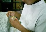 「カラーテスター」と言われる染色液を使って歯の汚れを確認した後、衛生士さんや坂本先生と一緒に歯ブラシを使って、汚れている部分を鏡で確認しながら丁寧に磨きあげました。