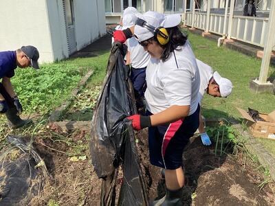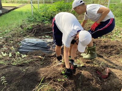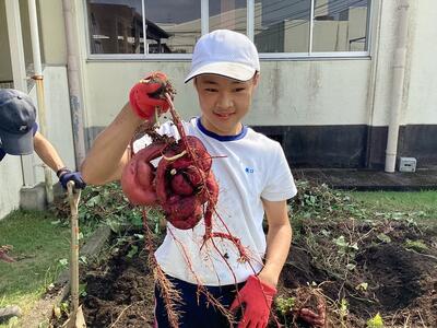 中学部2年生の学級園で育てていたサツマイモを掘りました。