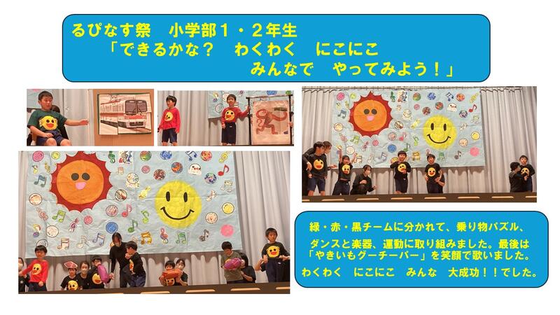 11月1日(土)にるぴなす祭が実施されました。小学部は3つのグループに分かれて、Aグループは「できるかな?」と様々なことにチャレンジして発表しました!みんなニコニコで楽しく発表できました(*^-^*)