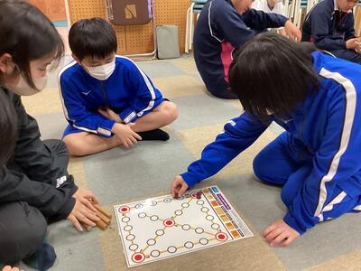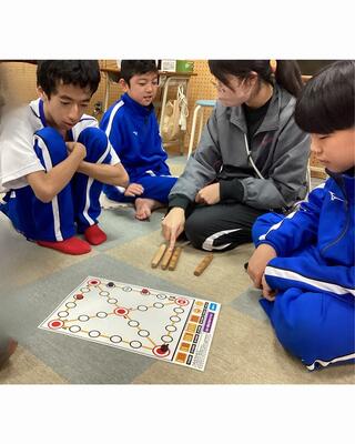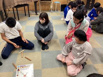 授業の中では、韓国の伝統的な遊び「ユッノリ」にも挑戦しました。すごろくに似たゲームで、チームごとに作戦を立てながら盛り上がり、白熱した勝負となりました。笑顔いっぱいの楽しいひとときでした。