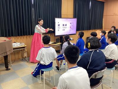 国際理解講座では、ヤン・へジョン先生をお迎えして、韓国の食べ物や遊びについて教えていただきました。
