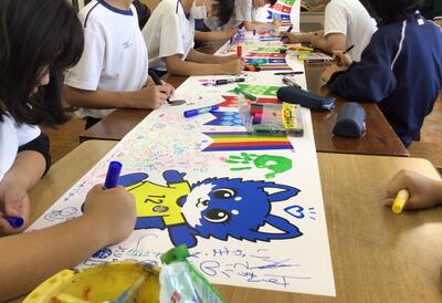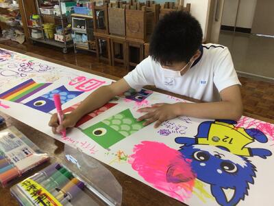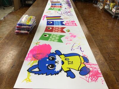 4月23日(木)ヴィアマテラス宮崎を応援する横断幕に寄せ書きをしました。「ファイト!」「つよい!」「がんばれヴィアマテラス!」などの熱いメッセージやサッカーボール、動物などのイラストもたくさん描きました。
