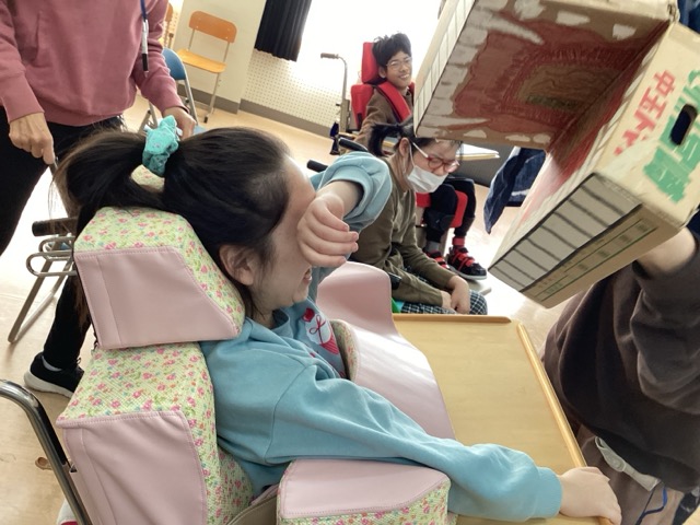 スイッチと連動する画面上の動きや色合いを目で追って楽しむ生徒、音を楽しむ生徒、周囲からの声援を受けて張り切る生徒、等々無理のないスタンスで皆楽しんで取り組みました。