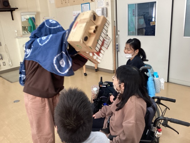 2月17日に、宮崎国際大学から通訳の学生を含め6名に来校いただき、今年度3回目の国際交流を行いました。今回は、インドやバングラデシュ、スリランカの留学生との交流を行いました。各国の音楽で踊ったり、ゲームをしてみたり、スリランカのシンハラ語で名前を書いてみたりと、異国の文化に今回もたっぷり触れることができました。子供たちも終始笑顔を見せながら、目を大きく見開いたり、上体を起こしたり、自分から手を伸ばしたりする姿も見られ、非常に意欲的に取り組んでいました。とても楽しい国際交流でした