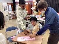 学習指導員の方々が、わかりやすく丁寧に教えてくださり、生徒たちは楽しみながら取り組むことができました。これまで小中学部でも染め物の経験があるため、手際よく作業を進める姿も見られました。