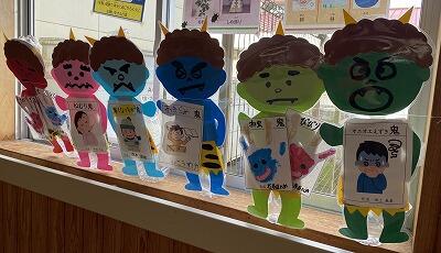 節分の豆まきをしました。「いやいや鬼」や「泣き虫鬼」など自分の中にいるやっつけたい鬼をみんなの前で発表しました。その後に鬼をボーリングのピンに見立て、ボールを使って倒しました。自分の鬼を倒してホッとしたのもつかの間。大鬼が出現!!「鬼は外!福は内」と言いながら、みんなで協力して鬼が嫌がる柊や福豆をもって立ち向かいました。鬼は逃げていき、みんなで喜んでいると、福の神が現れ、健康と幸福を祈ってくれました。鬼を退治できた皆さんにたくさんの福がきますように…。でも、まだ小鬼達がみんなを見張っているんです。鬼が出てこないように気をつけましょうね。
