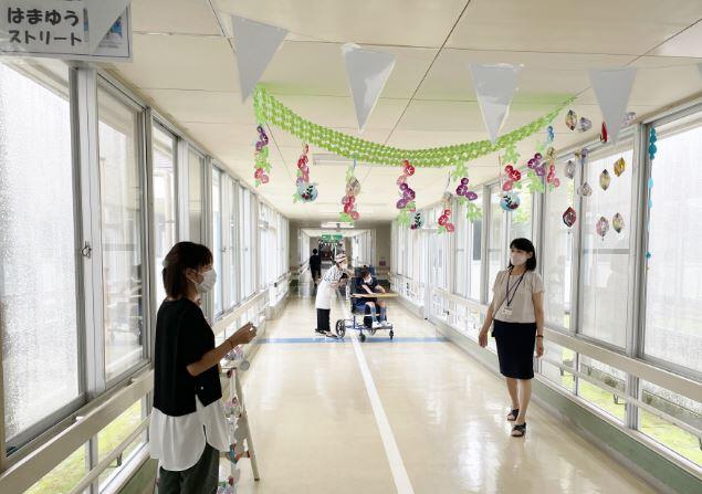 コロナ禍の中、少しでも気持ちが明るくなればと思い、夏らしい飾り付けを企画しました。いくつかの飾りには鈴が付けてあり、揺らすと音を聴く事ができる工夫をしました。子供達や先生方が廊下を通る際に楽しんで頂けたと思います。