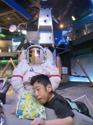 まず、入り口正面に展示されている、日本で唯一の月面着陸船の実物大模型と宇宙服の迫力にみんなびっくり!