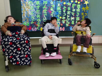 自立活動では、立位台やウォーカーにも乗り、3人とも今までの5年間の学習の成果を見せてくれました。