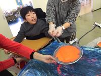 手形・足形をつかって獅子舞を作りました。絵の具をつけるのは