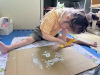 制作活動では、柄や手触りの異なる布に興味をもち、好きな布を選んで段ボールに貼り付けました。
