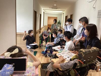 7月5日(金)高等部BCDクラス7名でスクールバスに乗り、宮崎市跡江にある、まほろば福祉会の施設を見学しました。とてもきれいな建物で天井が高く、廊下も広々としてとても気持ちの良い空間でした。車椅子の移動でも余裕たっぷりのジェンダーレストイレ(性別にかかわらず誰でも使える)もありました。また、この日はせいりゅうの先輩が、職員の方と一緒に施設の案内をしてくれ、生徒たちは、日々の暮らしなどについて質問もしました。