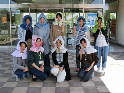 最後はみんなで作った防災ずきんをかぶって