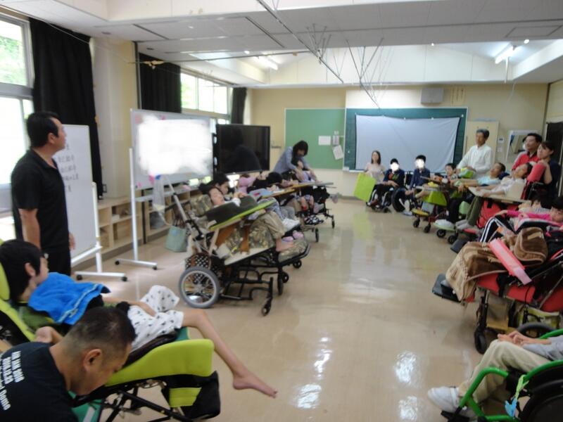 まずはじめに1年生から自己紹介を行い、好きなことやチャームポイントなど、スイッチやipadのドロップトークなどを活用して、それぞれ得意とする自発的な動きを用いて発表をしてくれました。