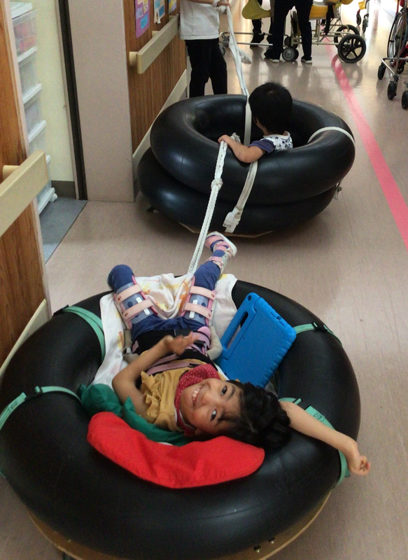 チューブカーや箱車、クッションチェアに乗って、スピードを感じたり、平坦な廊下や傾斜のある廊下、でこぼこした玄関の違いを体で感じたりする乗り物遊び。
