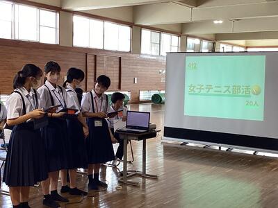 体育館にて人権集会を行いました。全体での挨拶の後、この日に向けて制作した人権標語の発表を学級ごとに行いました。今年度のせいりゅう祭のテーマであるSDGSについての動画視聴もあり、みんな真剣な様子で画面に見入っていました。最後に、小グループに分かれての質問タイムが設けられ、一人一つずつ隣合う友達に質問したり、質問に答えたりする活動を行いました。生徒からは「今回の活動で、より友達のことを知ることができて良かった。」という感想が聞かれました。今回の人権集会を通して、自分自身や友達について、より知ることができたようです。