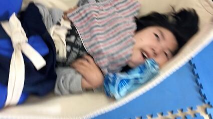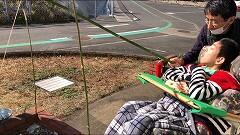 思っていたより熱いな~ 竿を持って、先生と一緒に「書き初め」燃やす場面