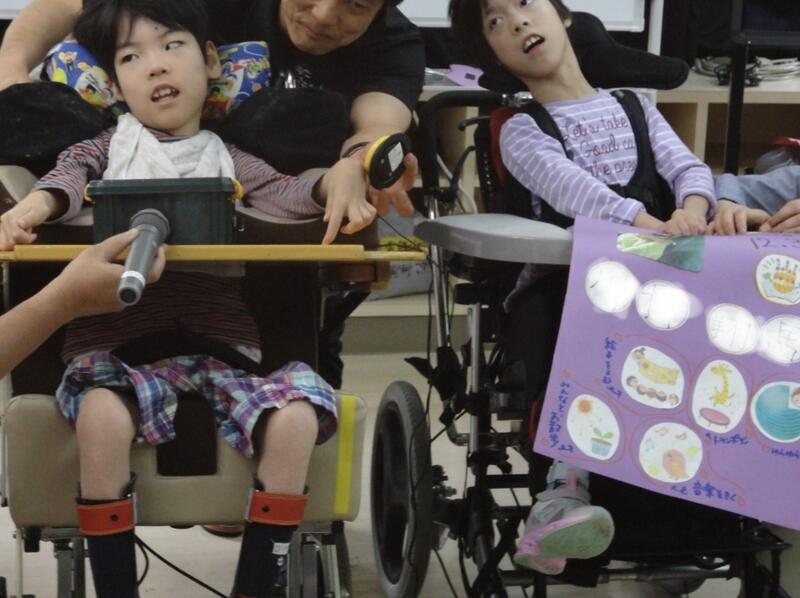 まずはじめに1年生から自己紹介を行い、好きなことやチャームポイントなど、スイッチやipadのドロップトークなどを活用して、それぞれ得意とする自発的な動きを用いて発表をしてくれました。