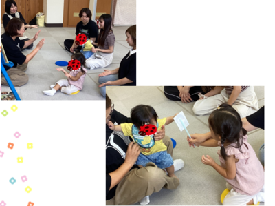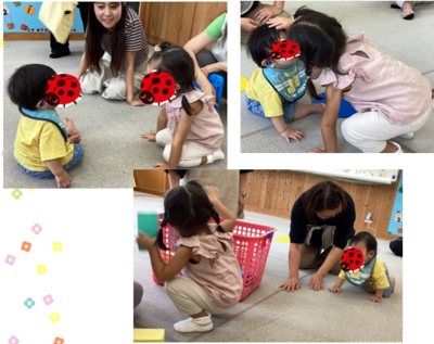 赤ちゃんはまだお友達と関わったことがないそうで、年少さんのことをじーっと見ていたかと思うと、はいはいで後を追ったり、近くにいって手を伸ばしたり。年少さんもまんざらではなく、なでなでしたり、握手をしていました。