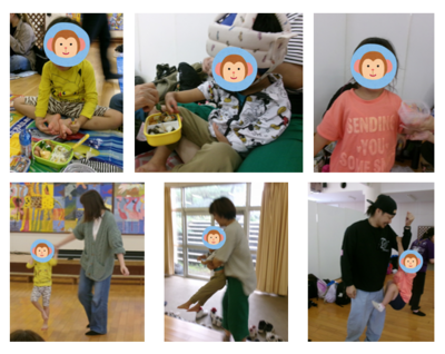親子レクリエーションでは、動物や乗り物の動きを表現しました。