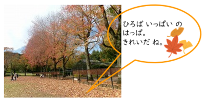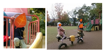 秋の木々が赤や黄色に変わっていて葉っぱのじゅうたんで敷き詰められた広場を思い思いに走ったり、たくさん集まった葉っぱを踏んだりしながら、足から伝わる音を楽しんでいるようでした。