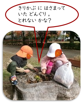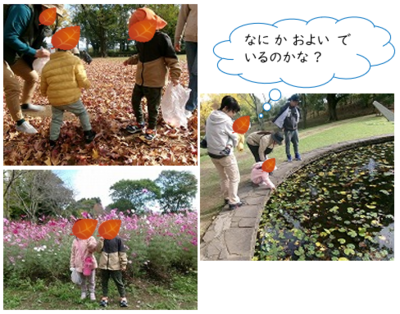 池を見つけると、その中をのぞいて水の中の生き物を想像たり、切り株を見つけては、友達と一緒にどんぐりを探したりと、自然いっぱいの植物園で、いろんなことを経験しましたね。