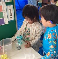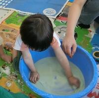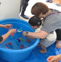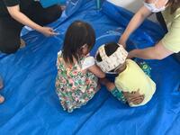 9月は色水遊び、4名の子供たちが参加しまし集まるとまずはそれぞれに遊び始めます。