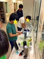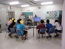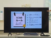 全員で食堂に集まり、スライドを見ながら「2学期に守ってほしい寄宿舎の5つのルール」について確認をしました。途中の話し合いでは、久しぶりに顔を合わせた友達や職員と、恥ずかしそうにしながらも笑顔で談笑する様子が見られ、和やかな雰囲気に包まれました。