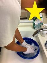 靴下と洗剤を使って揉み洗いの方法と洗剤量について学び、