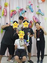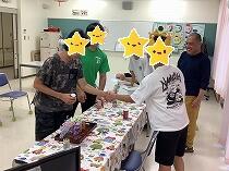 誕生会は、準備から司会進行まで舎生が中心になって取り組みました。プレゼントは、職員手作りの誕生カードと舎生みんなで作った花束を渡し喜んでいました。乾杯のジュース選びも盛り上がり、盛大に誕生者を祝う会になりました。