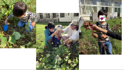 幼稚部の友達とお父さん、お母さん、先生たちとで芋ほりをしました。