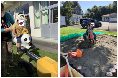 今日初めててんとうむしに参加した年少のお友達は、大好きな乗り物に乗って、砂を積んだり運んだり。最初ドキドキしていたみたいだけど、このころにはママと離れても平気でした。