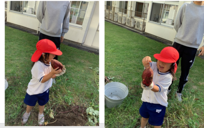 持って帰ったお芋は、おうちで何に変身してみんなのおなかに入ったかな?お話を聞くのを、先生たちは楽しみに待っていますね。