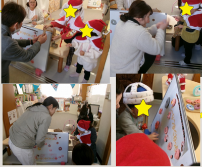 みんながそろうまで、ツリーに飾るオーナメントを作りました。台紙に自分の写真やドットシール、星の形のシールをぺたぺた。ツリーに飾るととても華やかになりました。