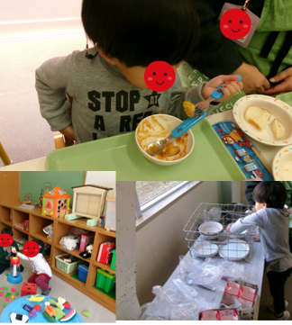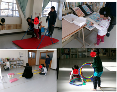 両足跳びに平均台、マットで横転、鉄棒にぶら下がり、トランポリンにボーリング。いろいろな運動を「こうすればいいんだな」と理解して楽しく取り組みました。「もうおしまいだよ」の合図に「もっとしたかったー」と泣いてしまうほどでした・・・。