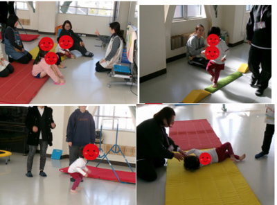 さて、午後は運動遊び。広いお部屋に平均台や、マットが並べられています。「サーキット」っていうんだって。