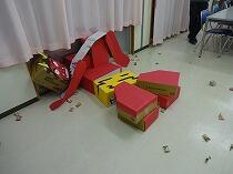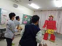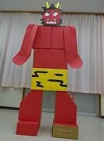 今回は巨大な鬼に向かって豆やお菓子、新聞紙ボールを投げて、
