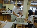 リアルに再現した投票所で模擬投票を体験した生徒達。小選挙区、比例代表、国民