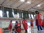 〈ボッチャ〉~ 青のゼッケン「セントラル・パシフィック・リーグチーム」vsピンクのゼッケン「ポニョ・エヴァンゲリオン・ねずこチーム」で対戦しました。
