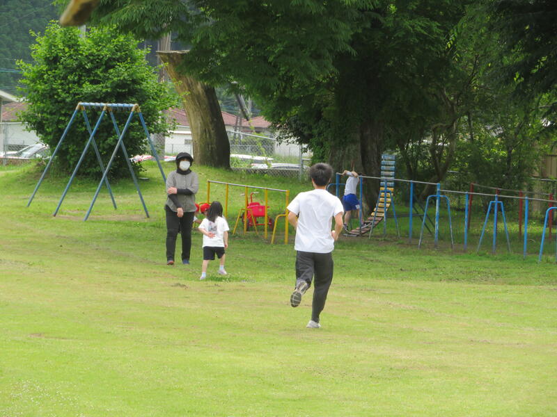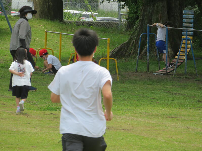 今日の午前、小学部の様子をのぞいて見ると・・・東方小学校のグランドで、遊具で遊ぶ子供たちや鉄棒に励む子供たちを発見!