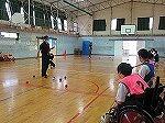 〈ボッチャ〉~ 青のゼッケン「セントラル・パシフィック・リーグチーム」vsピンクのゼッケン「ポニョ・エヴァンゲリオン・ねずこチーム」で対戦しました。