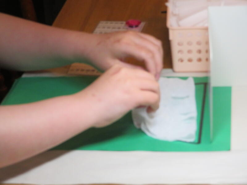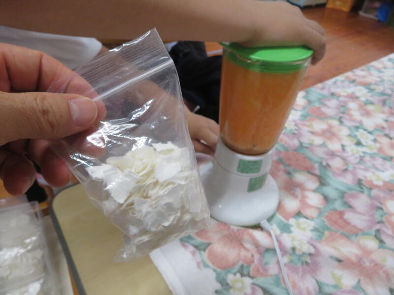 「こどもたちが飲んだ後の牛乳の紙パックを洗って、乾かし、こどもたちがちぎったものを使うんですよ。」