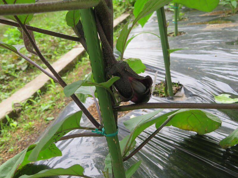 「なすびの花がついてますね。ピーマンは順調ですが、なすびは夏の収穫に間に合うかどうか・・・」