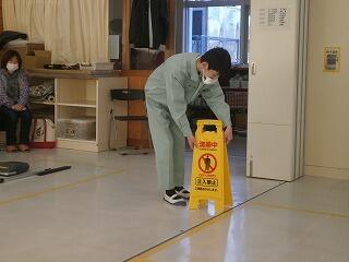 まずは作業表示板を置きます。置く向きや置く位置にも 掃き残しがないように、自分の足の1足分ずつ進んで