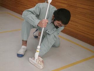ラインの内側にほうきの端を沿わせて掃きます。素早く 掃き終わったら、ごみの取り残しが落ちていないかを